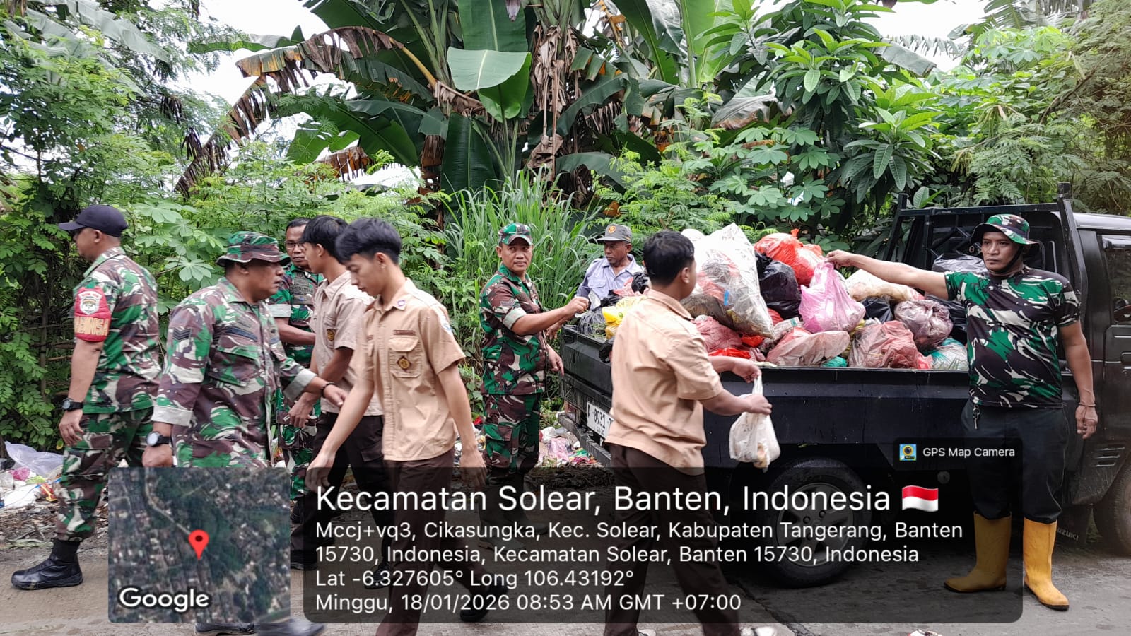 Sebagai wujud nyata kepedulian TNI terhadap kebersihan lingkungan sekaligus bagian dari pelaksanaan tugas pembinaan teritorial (Binter), Serma Suhenda Babinsa Koramil 13/Cisoka, Kodim 0510/Trs kerja bakti membersihkan sampah di PerumbBukut Cikasungka, Kecamatan Solear Kabupaten Tangerang, Minggu (18/01/2026).